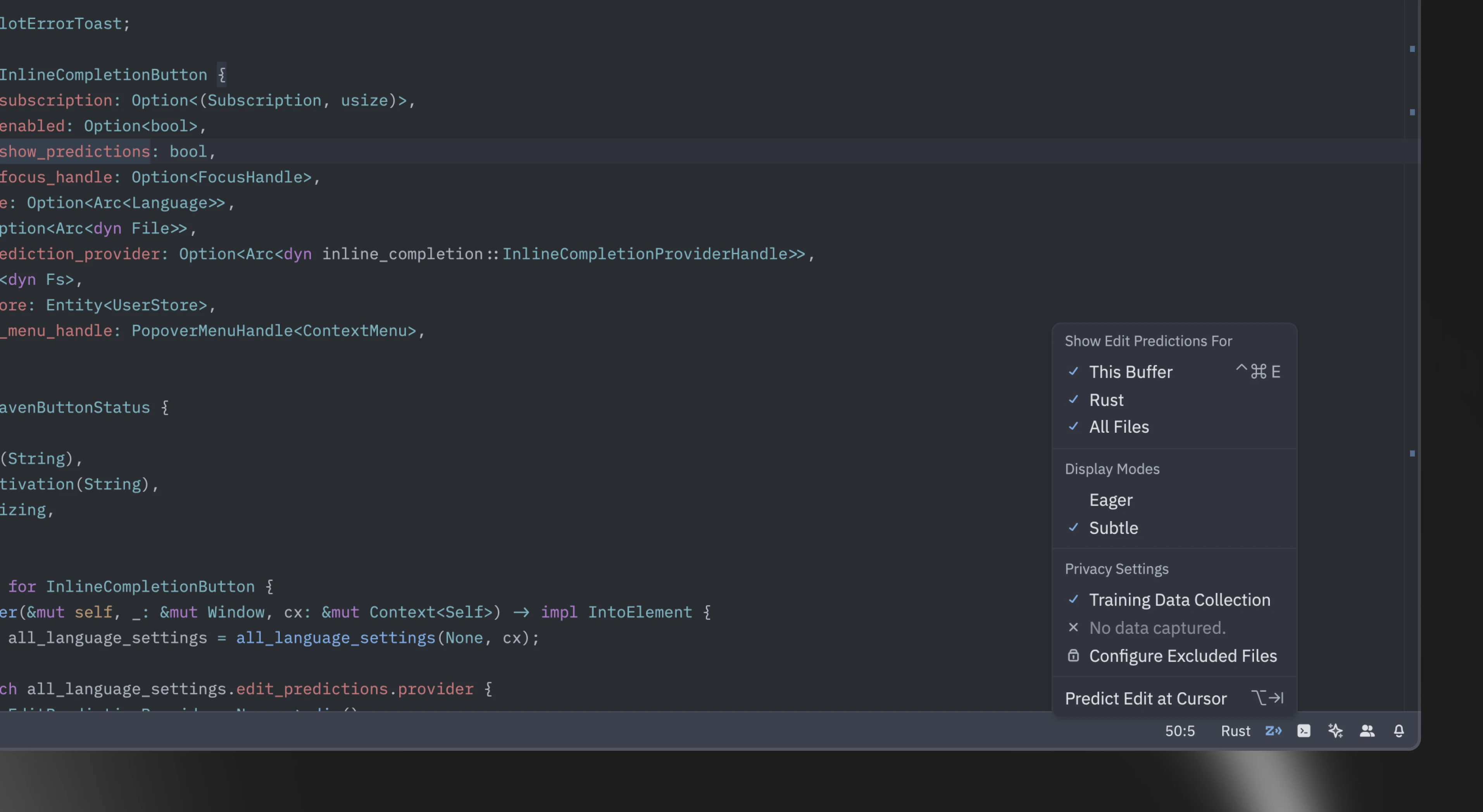 A few weeks ago, we released Edit Prediction, Zed's native prediction mechanism, powered by Zeta, our new open source, open data model.