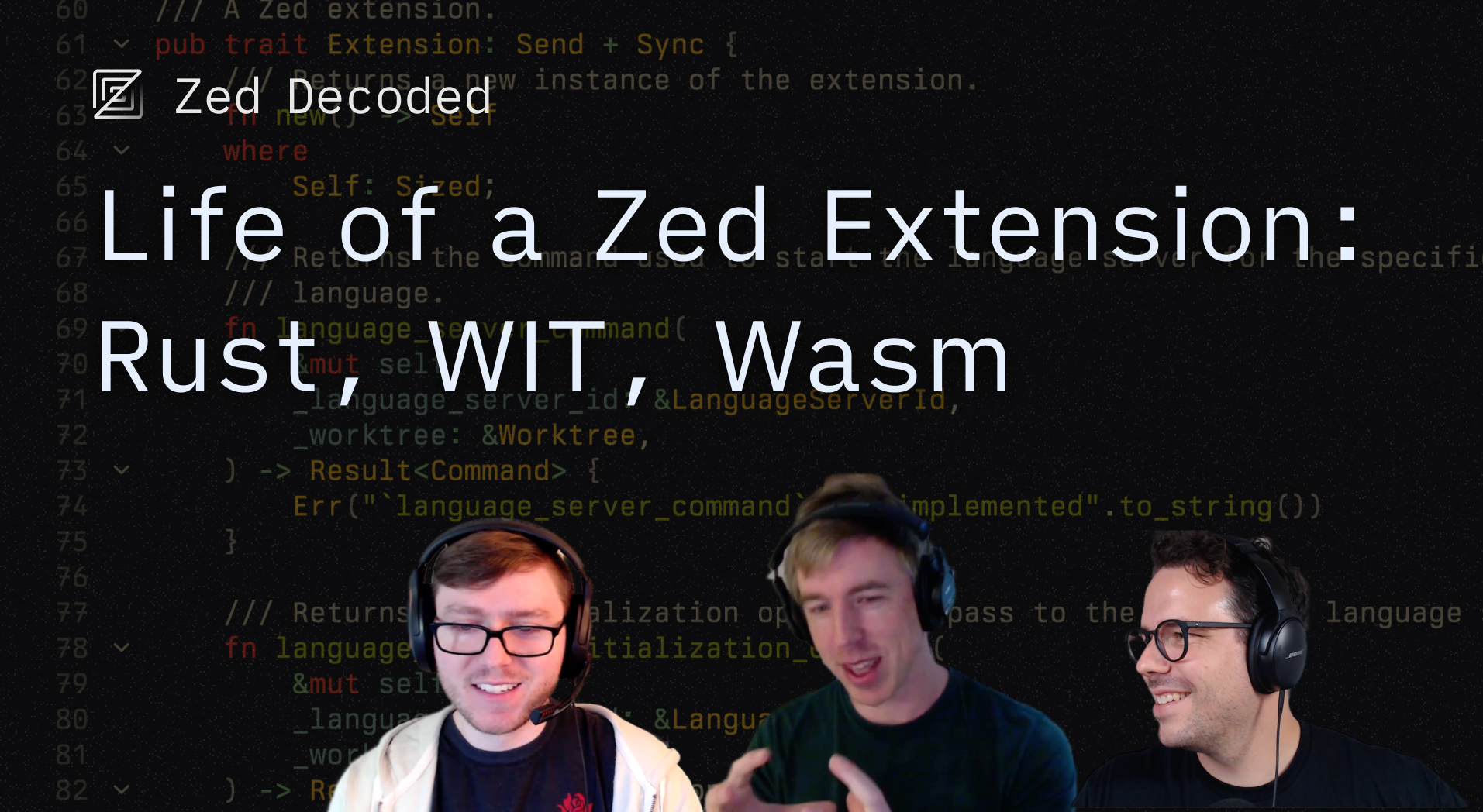 This post comes with a 1hr companion video, in which Marshall, Max, and Thorsten explore extensions in Zed, digging through the codebase to see how Rust, Wasm, WIT and extensions fit together and end up running in Zed.
