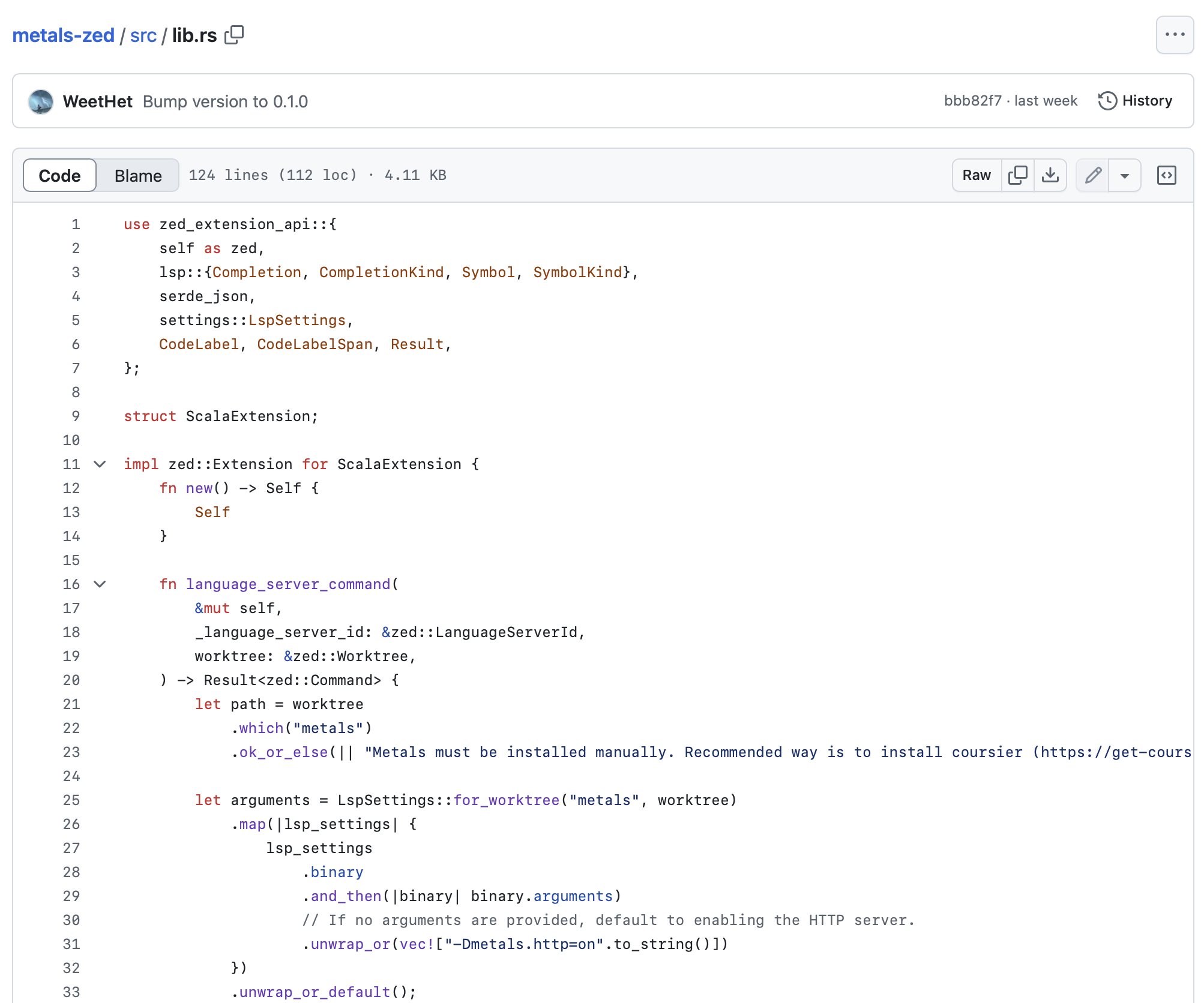 The extension I used as an example to ask "what happens when I install this?" was the zed-metals extension. It adds support for Scala to Zed by adding the Scala Tree-sitter parser, Tree-sitter queries, and — the interesting bit for me in that conversation — it also adds support for the Metals language server.