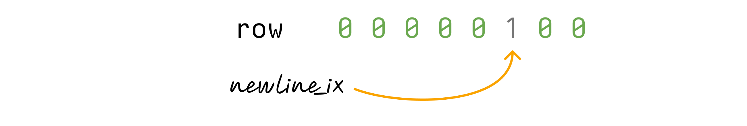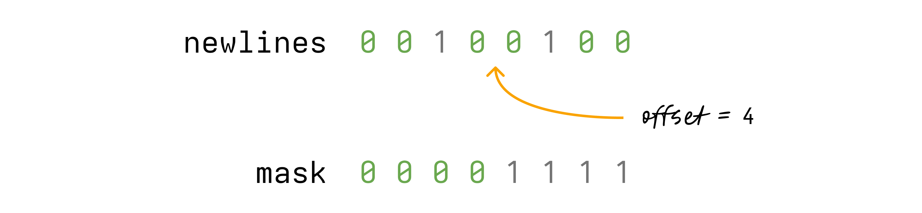 let row = (newlines & mask).count_ones() as u8; // row = 1That's the row the offset is on — 1 in our case. It's zero-indexed, meaning