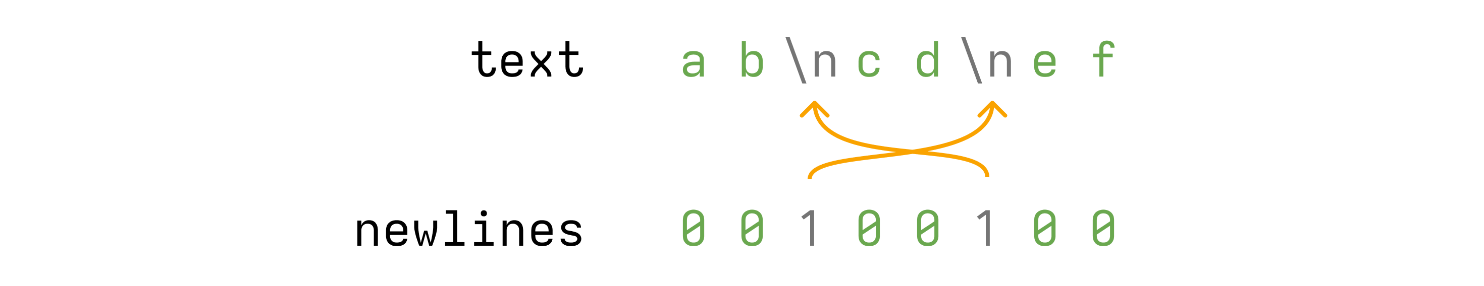 newlines now tells us that the 3rd and 6th characters in text are newlines.